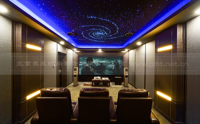 KEF体验厅打造为9.1.4声道全景声家庭影院系统,2只CI5160RL THX和1只CI3160 THX组成前置三声道,由6只CI3160 THX担任环绕声道,4只CI200RR THX作为全景声顶置音箱。THX认证的家庭影院系统是按照专业录音棚音响效果的标准设计,客户通过THX认证音箱听到的电影导演所要表现的真实原音,体验厅选用的全部音箱都是通过THX认证的产品,而同轴共点单元设计让CI系列音箱在声音表现方面更加稳定与真实,超薄的箱体隐藏在家庭影院幕布和整体墙面装饰之下,天花星空中若隐若现的4只音箱,深色的音箱面饰与固定盒,与星空顶融为一体,既不张扬,也不会让人忽略它的存在。