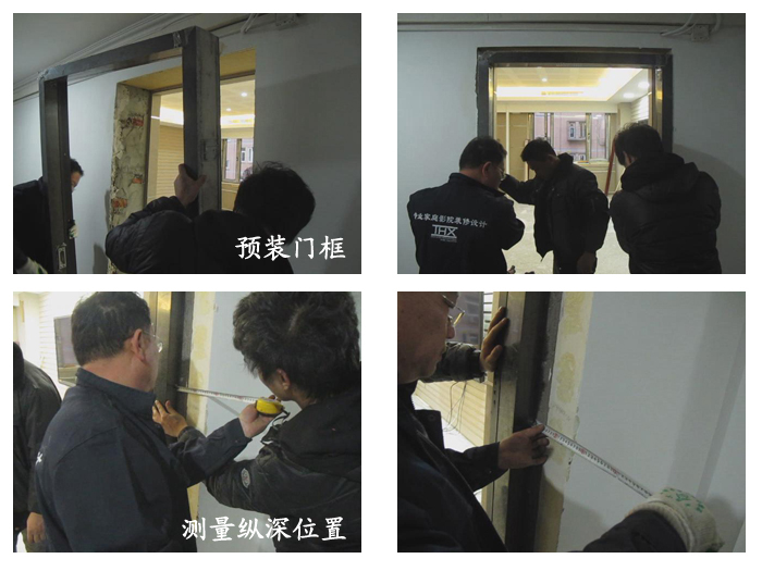 第2步:预装门框,将门框推入门洞,用尺子测量门框左右两侧的纵深位置,纵深位置需保持一致。安装门框时需从门框的垂直、水平、纵深三个维度上进行调节找平,保证安装不倾斜。