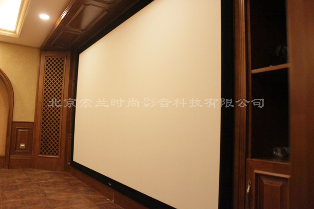由木质结构打造的透声前墙,150寸透声画框幕布将前置家庭影院音响设备完美的隐藏起来,透过爱普生8200投影机的投射在幕布上的高清图像,让人体验到超大高清画面的视觉震撼。